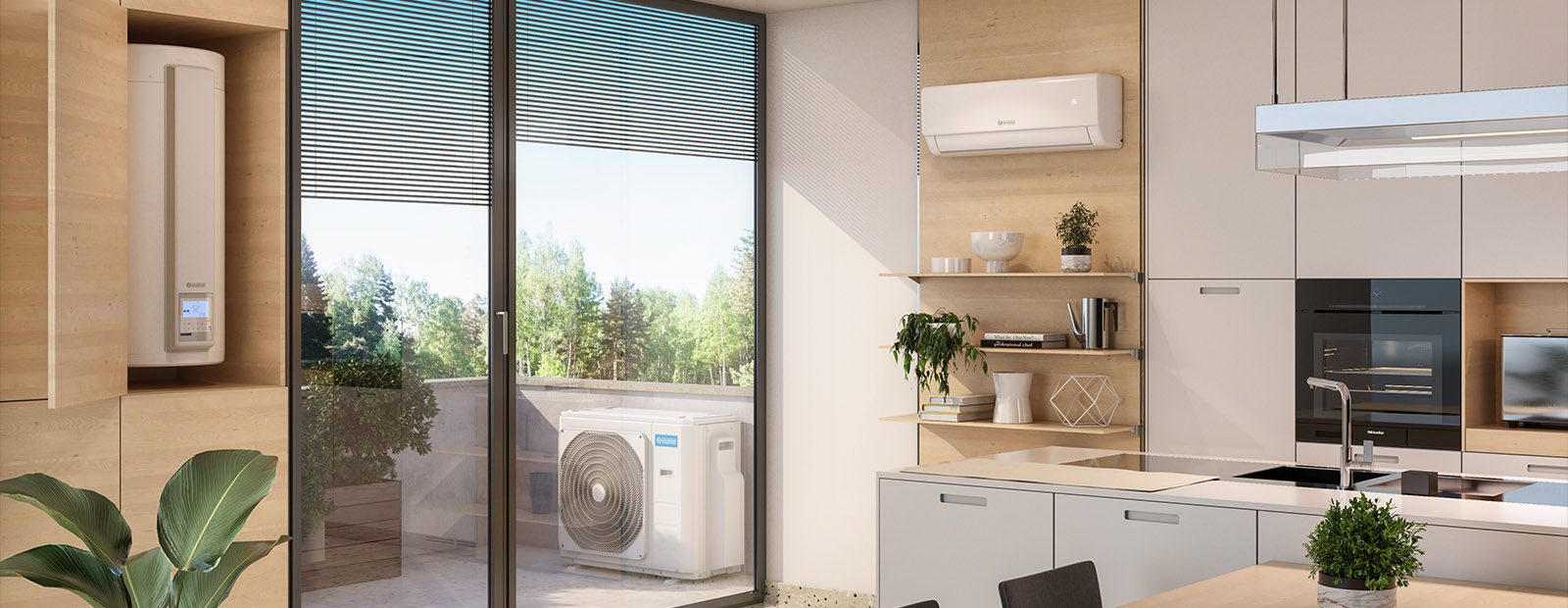 Die Anlage besteht aus einer Außeneinheit, einem Warmwasserspeicher und bis zu 3 Inneneinheiten.